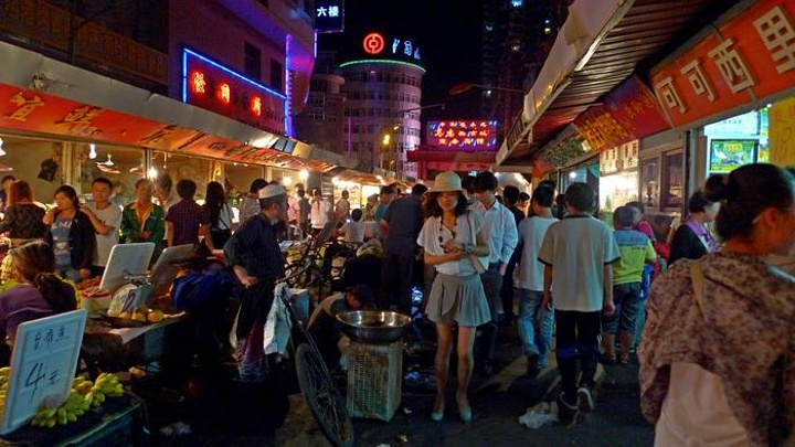 大新美食街上全是排档,很有西部风味,基本都是清真的,牛羊肉为主。手抓羊肉、羊蹄、牛蹄、牛骨、手抓饭和一些面食味道都很好,吃肉是用刀割的,很有豪迈的感觉。
