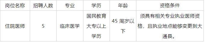 资格条件: 必须具备相关专业执业医师资格,且执业地点能变更至大通县。