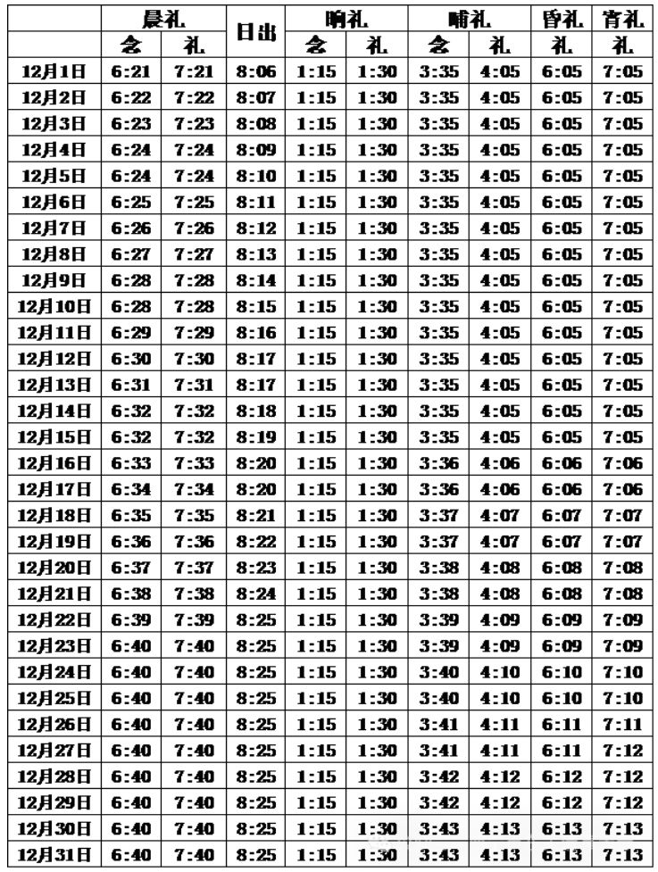 2025西宁12月五时拜功时间表