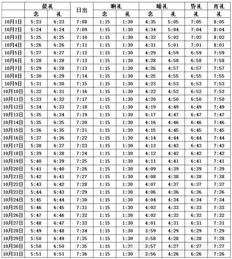 2025西宁10月五时拜功时间表