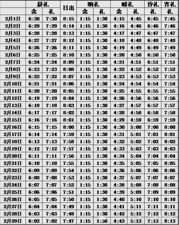 2025西宁2月五时拜功时间表
