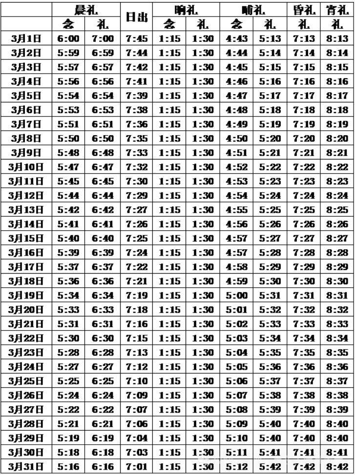 二、日礼(Dhuhr) 日礼时间一般在正午之后到日落前,具体时间如下: - 13:00-15:00(正午之后)