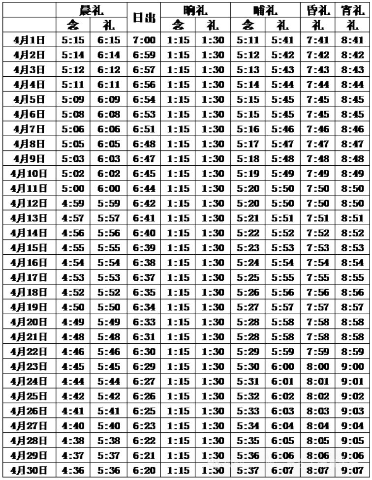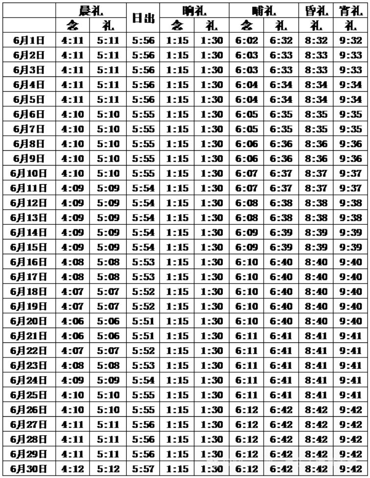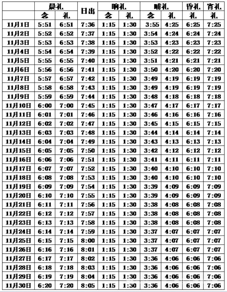 一、晨礼(Fajr) 晨礼时间一般在日出前的一段时间内,具体时间如下: - 5:00-5:20(日出前)