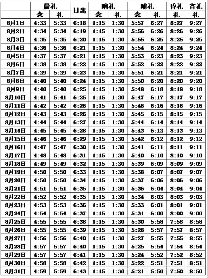 三、晡礼(Asr) 晡礼时间一般在日落之后到日落后的一段时间内,具体时间如下: - 18:00-19:00(日落之后)