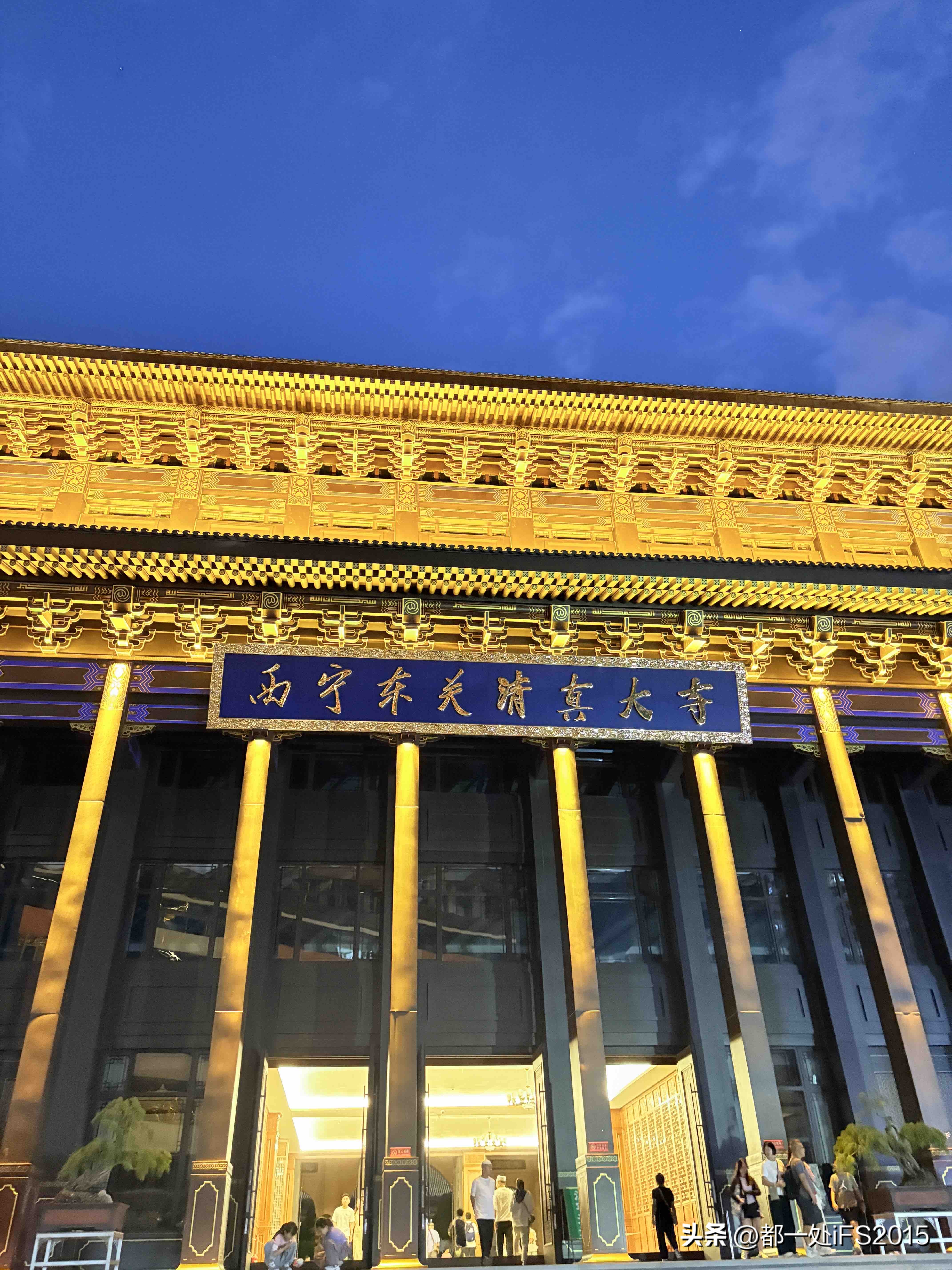 下南关街旁边就是著名的东关大寺,其全称是“西宁市东关清真大寺”,规模非常宏伟,是全国五大清真寺之一,也是全国重点文物保护单位,有着浓厚的阿拉伯风格和中式传统建筑风格混合的特色。我们到的时候已经是晚上九点,即便是西北的天此时也完全黑了,但是这座清真寺的广场上却灯火璀璨,这里有许多很大的太阳伞,便于人们白天遮阳。同时整个寺院的建筑采用绿色琉璃瓦等建材,中式六角亭式建筑更增添了古朴典雅气息。如果不看屋顶上的绿琉璃瓦、新月和门额上的阿拉伯文的话,还真不容易一眼就看出这是一个清真寺。主殿前面拉着警戒线,不让游客进入。看得出里面的主体也是木构斗拱结构,加上大门两侧的对联,看上去满满的“中国风”。