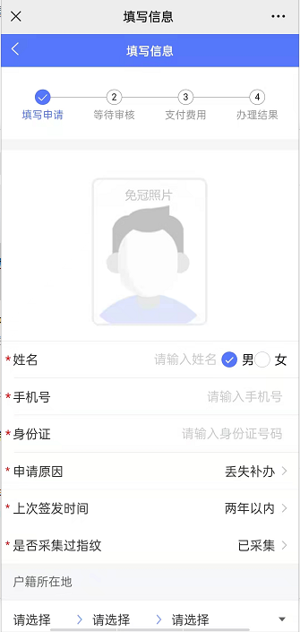 #### 3. 填写申请信息 - 根据系统提示,填写您的个人信息,包括姓名、性别、出生日期、住址等。 - 选择身份证件类型(身份证)和补领原因。